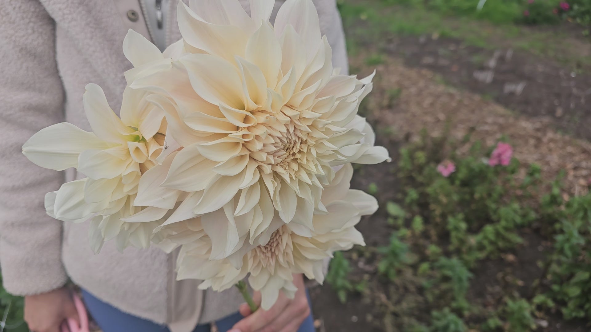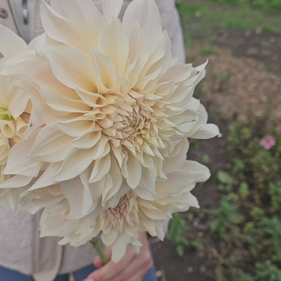 The Café au Lait dahlia is a beloved showstopper, renowned for its enormous 8–10 inch blooms in creamy shades of blush, latte, and soft peach that shift beautifully with the light. Reaching 3–4 feet in height, this variety’s lush, romantic petals have made it an enduring favourite — and it’s easily been one of the highlights on our flower farm this year