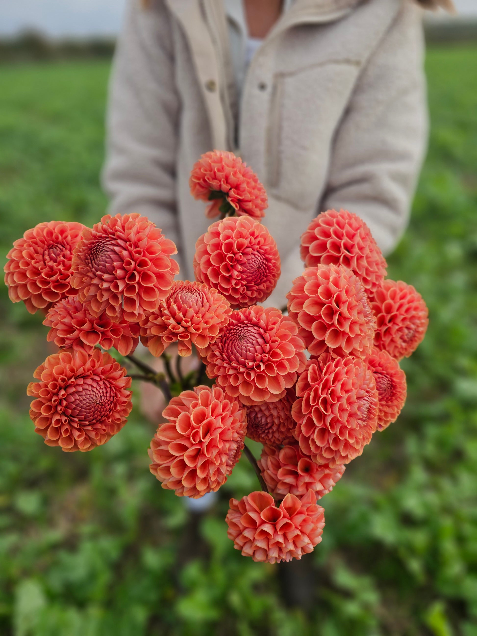 The Cornel Bronze dahlia is a striking and dependable variety, producing perfectly rounded 4–5 inch blooms in rich coppery-orange tones that glow warmly in the sunlight. Growing to around 3–4 feet tall, it’s a vigorous and productive plant with strong stems ideal for cutting — and it’s been one of my absolute favourites on our flower farm this year for its vibrant colour, durability, and stunning presence in autumn bouquets.