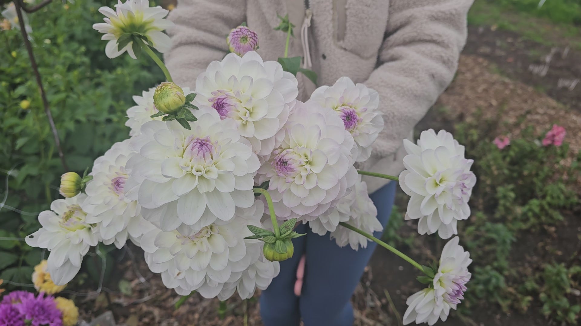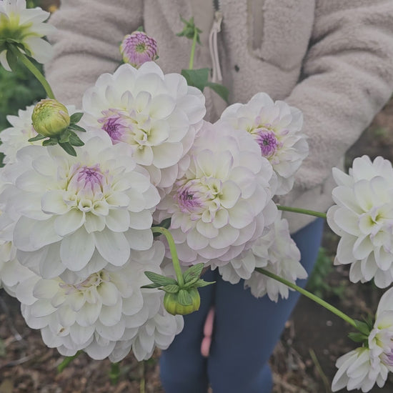 The Eveline dahlia is an elegant and refined variety, displaying 4–5 inch blooms of creamy white petals delicately edged in soft lavender, with a subtle hint of lilac radiating from the center. Reaching about 3–4 feet in height, it’s a strong and reliable bloomer — and it’s been one of my absolute favourites on our flower farm this year for its serene beauty and timeless grace in every bouquet.