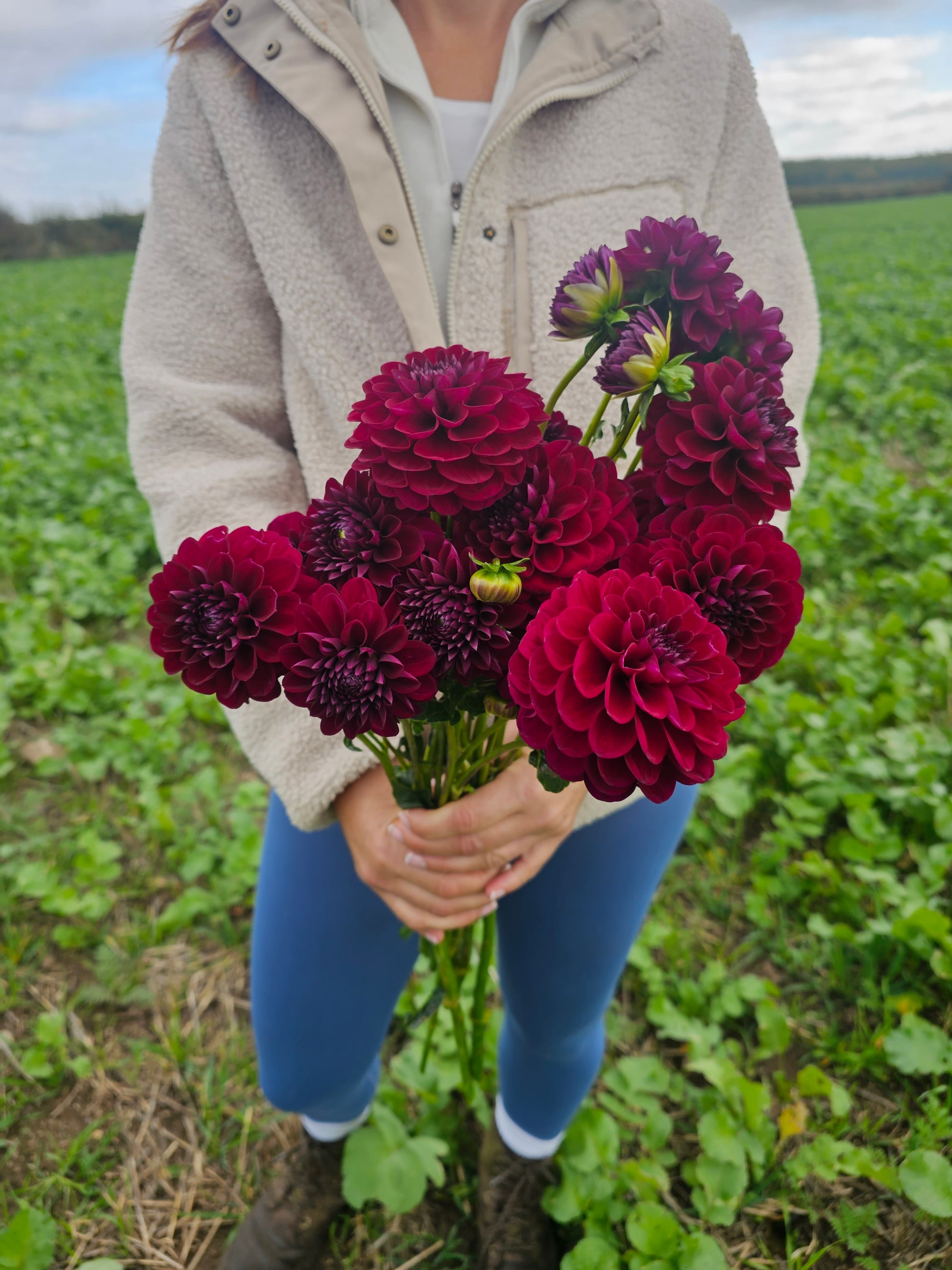 The Jowey Mirella dahlia is a sophisticated and dramatic ball-type variety, featuring perfectly formed 3–4 inch blooms in deep, velvety burgundy that almost appears black in certain light. Growing to around 3–4 feet tall, it’s a reliable and long-lasting bloomer with sturdy stems and exceptional vase life — and it’s been one of my absolute favourites on our flower farm this year for its rich colour, symmetry, and striking elegance in every arrangement.